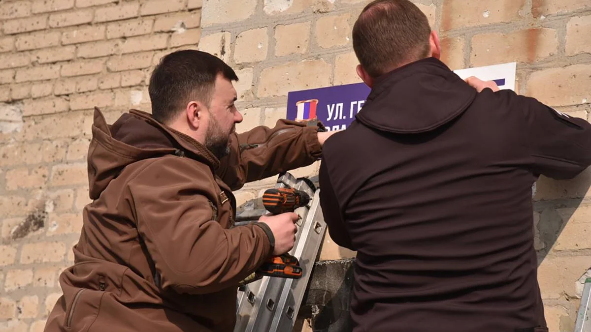 Андрей Турчак и Денис Пушилин прикрепляют таблицу с новым названием улицы в Волновахе. Фото: Единая Россия