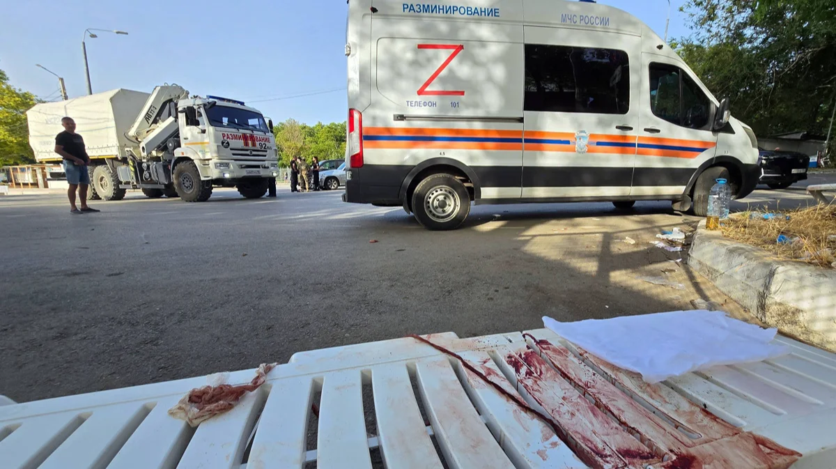 Окровавленный лежак на фоне машин разминирования после обстрела Крыма в Севастополе, Украина, 23 июня 2024 года. Фото: Константин Михальчевский / Спутник / Imago Images / SNA / Scanpix / LETA