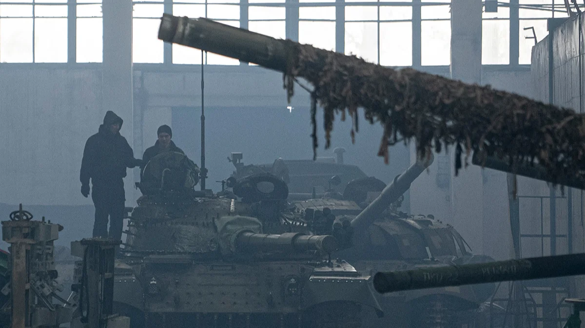 Рабочие на крыше танка Т-64 на ремонтном танковом заводе в Харькове, Украина, 31 января 2022 года. Фото: Evgeniy Maloletka / AP / Scanpix / LETA