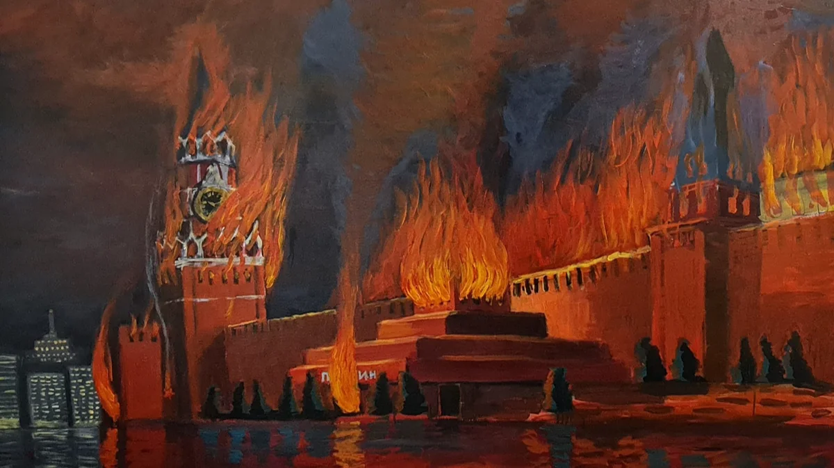 На картине, висящей над кроватью, изображен российский военный корабль, тонущий в Черном море. На второй — украинские войска, с недавних пор воюющие на территории России. Кремль горит на третьей, как подчеркивается, «любимой картине Зеленского». Сам президент Украины считает, что «каждая из картин — о победе».