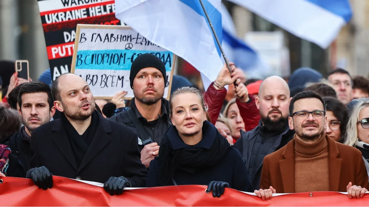 Владимир Кара-Мурза, Юлия Навальная и Илья Яшин участвуют в антивоенной демонстрации в Берлине, Германия, 17 ноября 2024 года. Фото: Filip Singer / EPA