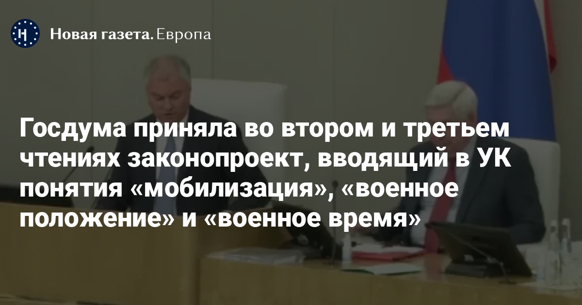 Госдума приняла во втором и третьем чтениях законопроект, вводящий в Уголовный кодекс понятия «мобилизация», «военное положение» и «военное время». Трансляция заседания велась на сайте нижней палаты парламента.