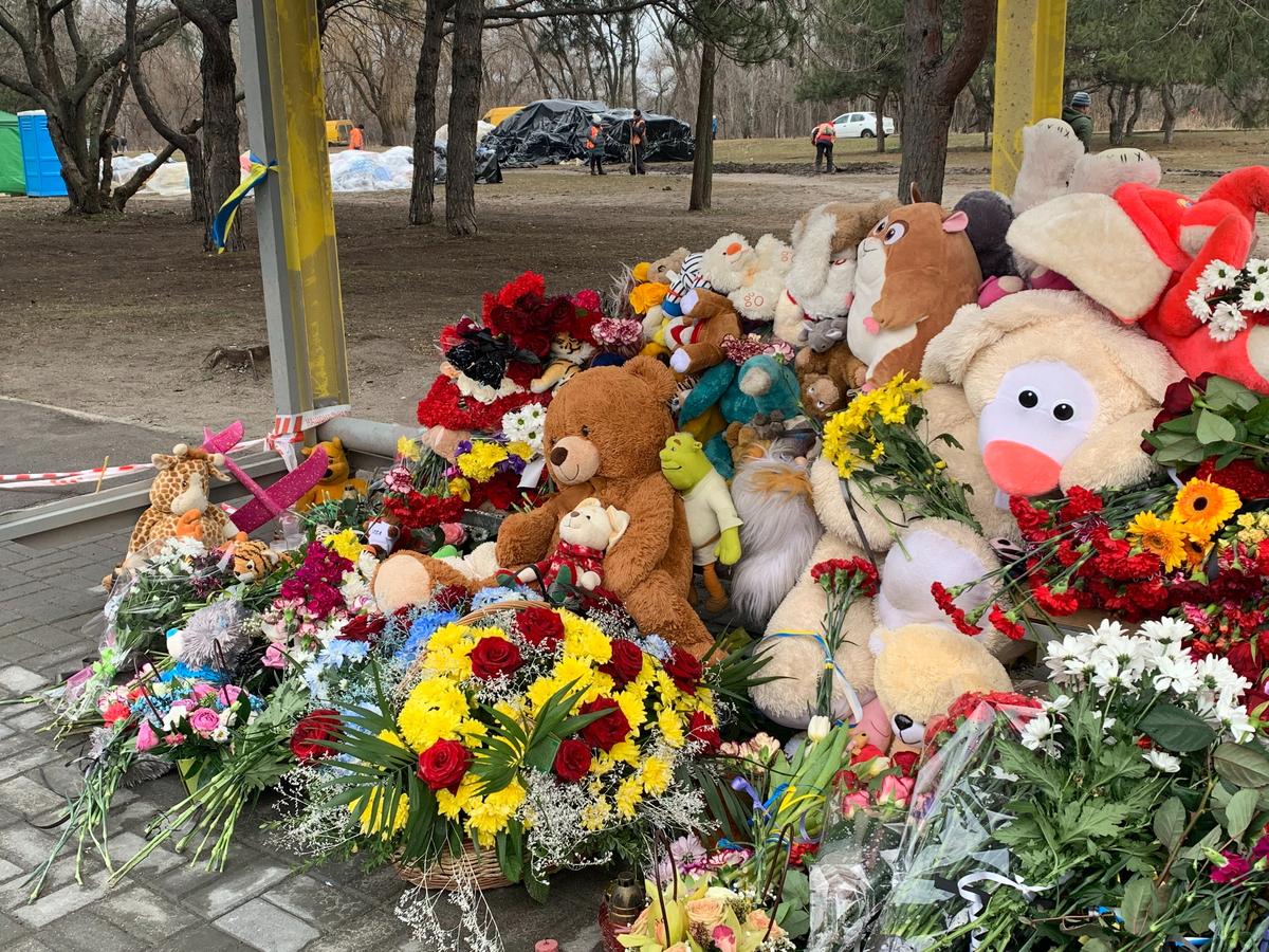 На фонарном столбе рядом со стихийным мемориалом скотчем приклеено объявление: «Психологическая поддержка 31 бригады имени генерал-майора Александра Радзиевского, горячая линия (телефон), психолог Юлия (телефон)». Бойцы Национальной гвардии, которые доставали из-под плит расплющенные человеческие останки толщиной в лист бумаги, — не железные.