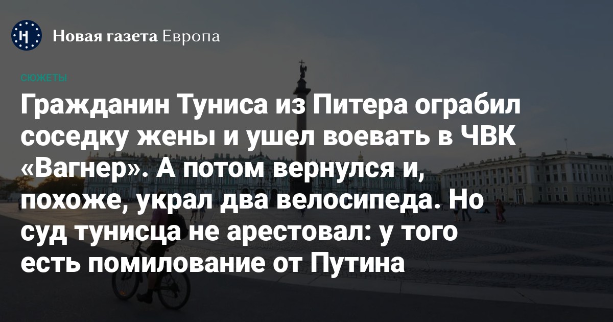Выборгский районный суд Петербурга отказал следствию в ходатайстве о заключении под стражу гражданина Туниса Бен Ахмед Шерифа, обвиняемого в кражах. Как следует из постановления суда, решающим фактором явилось то, что тунисец служил в ЧВК «Вагнера», принимал участие в боевых действиях на территории Украины и имеет государственную награду Российской Федерации.