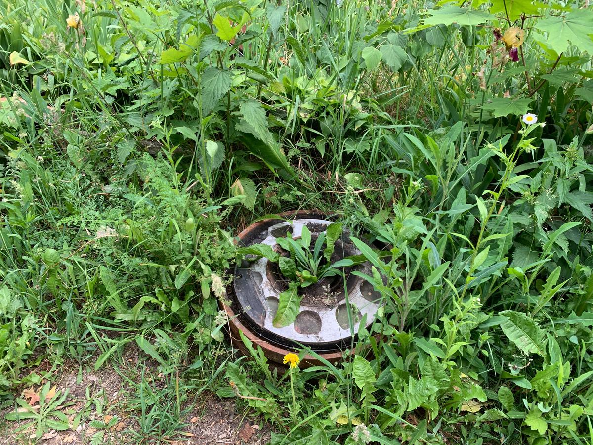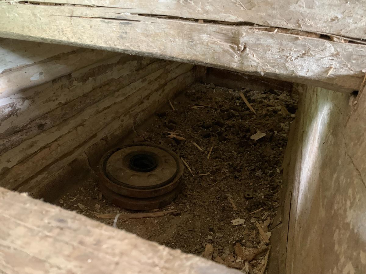 Танковые колеса до сих пор валяются на территории неподалеку от сруба-лабаза, который пробило насквозь. Фото: Ольга Мусафирова, специально для «Новой газеты Европа»