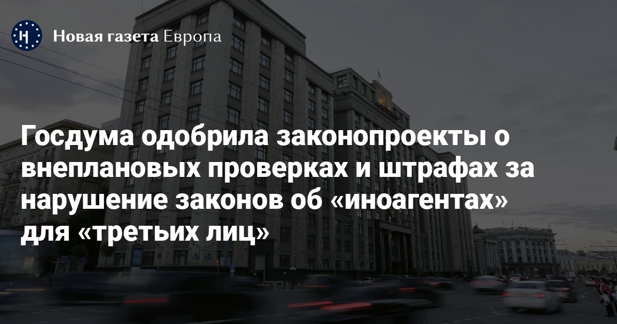 Государственная дума РФ приняла во втором и третьем чтениях два законопроекта, которые введут внеплановые проверки и штрафы за нарушение законодательства об «иноагентах» для лиц, взаимодействующих с «иноагентами». Об этом сообщается на сайте ГД.