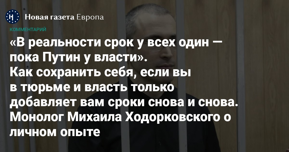 Тактика постепенного увеличения сроков путем заведения новых уголовных дел для российской власти не нова: по такому же принципу развивалось, например, «дело ЮКОСа». Самый тяжелый аспект в этом смысле — моральный: человек, получающий все новые и новые наказания, перестает видеть образ будущего. Как в таких условиях не пасть духом и продолжить адекватно воспринимать действительность? «Новая газета Европа» спросила об этом у политика Михаила Ходорковского, который провел в заключении по «делу ЮКОСа» 10 лет. Учитывая репрессивный настрой российского политического режима, рекомендации Ходорковского могут быть полезны не только для Алексея Навального.