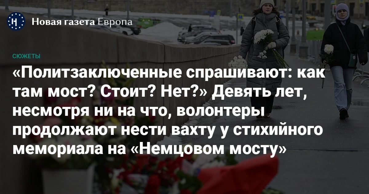 Все эти девять лет они подвергались избиениям и оскорблениям, после каждого нападения и осквернения места памяти им приходилось заново восстанавливать мемориал. Они стоят на Большом Москворецком — «Немцовом» — мосту почти круглосуточно, меняют воду в цветах, чистят снег, следят за тем, чтобы мемориал не мешал прохожим.