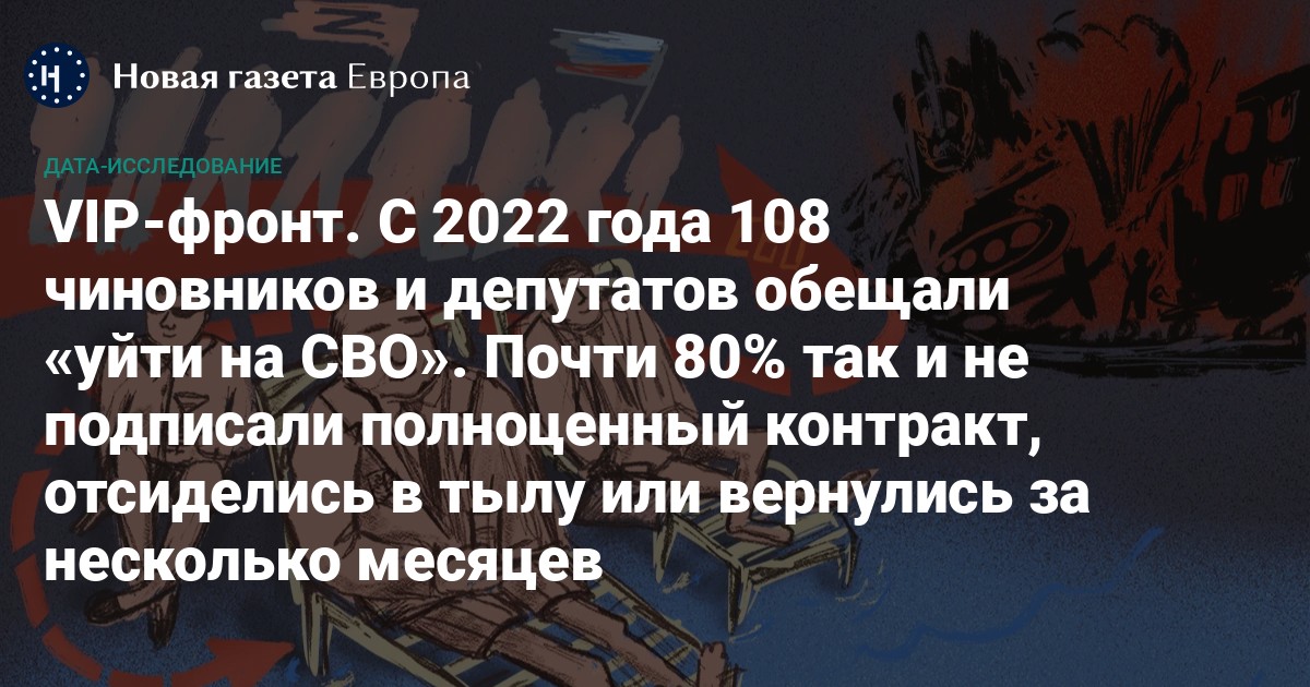 Почти за три года полномасштабной войны 108 российских чиновников и депутатов федерального и регионального уровней заявили о намерении отправиться на «СВО». 18 человек ушли на войну, чтобы избежать тюремных сроков, а 20 обещали, но так никуда и не ушли. Из тех, кто в итоге оказался на фронте по своей воле, подавляющее большинство служат на льготных условиях ― с минимальными рисками для жизни, периодически отлучаясь на отдых в Турцию, футбольные матчи и заседания парламента, выяснила «Новая-Европа». Половина чиновников-фронтовиков провела на такой службе 6 месяцев или меньше.