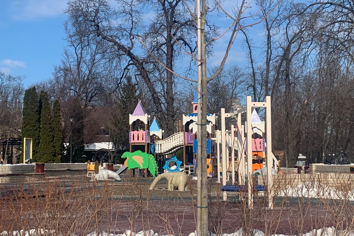 На месте детской площадки — горки, качели, забавные скульптуры — образовался кратер. Нескольких берез и каштанов как не бывало. Те, что уцелели, превратились в обожженные обрубки.