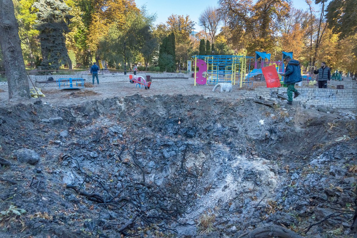 Кратер после ракетного удара на детской площадке в центре Киева, 11 октября 2022 года и та же детская площадка в феврале 2025 года. Фото: Efrem Lukatsky / AP Photo / Scanpix / LETA / Ольга Мусафирова.