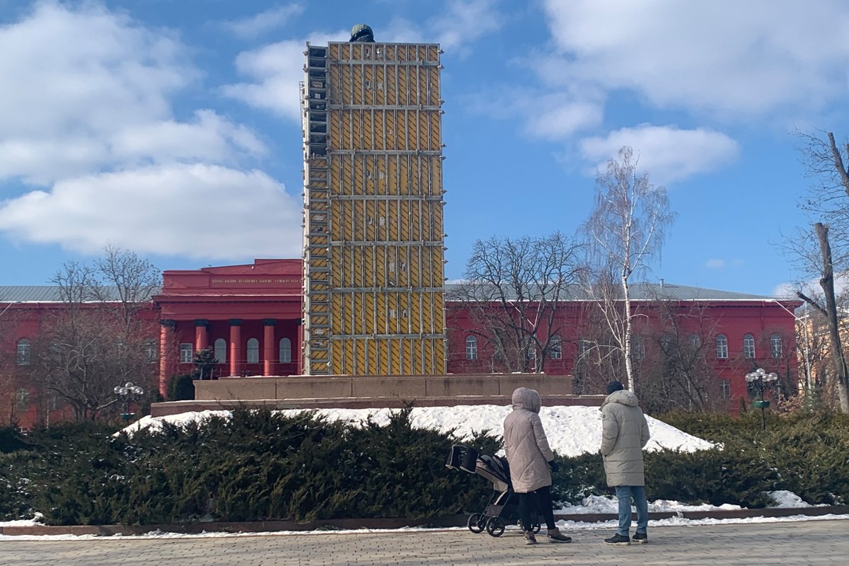 …Вошла в Шевченковский парк, что напротив Красного корпуса национального университета имени Шевченко. Памятник поэту — в защитном «кожухе», который способен спасти от осколков. Ранней весной, как только сойдет снег, снова зацветет клумба у подножия. Такая же щитовая защита окружает монумент Михайла Грушевского, украинского историка, выдающегося общественного деятеля, главы Центральной Рады Украинской народной республики. Памятник Грушевскому — рядом с так называемым Желтым корпусом университета. А Илья Репин у Национального музея искусств имени Богдана и Варвары Ханенко (чета известных украинских промышленников-меценатов XIX века) как будто забинтован с головы до постамента.