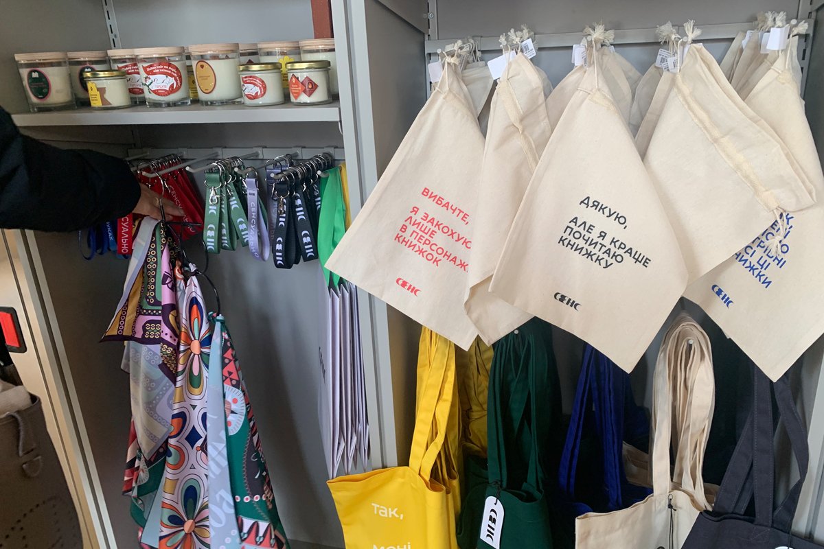 Примерно полгода назад в зале обращал на себя внимание стенд с призывом «Обменяйте русские книги на донат» и делениями на «шкале русофобии»: «всё еще недостаточная», «тайная», «осознанная», и так далее. Злой мем, рожденный во время большой войны, работал. Рядом высились стопки книг, явно из домашних библиотек: потрепанная советская классика вроде Максима Горького, фолианты в суперобложках об истории России и царской династии, русскоязычная продукция сравнительно недавних лет от украинских издательств. «Сенс» вместе с несколькими общественными организациями провел акцию и, по словам основателя книгарни Алексея Еринчака, собрал около 25 тонн литературы на русском. Ее сдали на переработку, получили 150 тысяч гривен, деньги направили на потребности ПВО Вооруженных сил Украины.