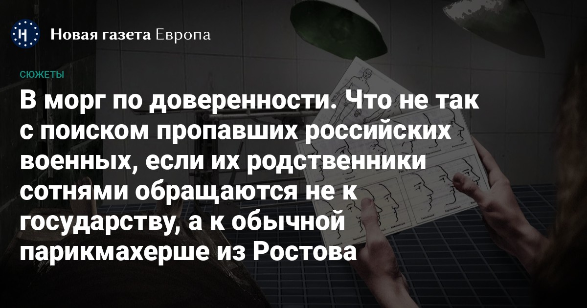Издание «Ветер» разыскало эту волонтерку. Ею оказалась парикмахерша из Ростова-на-Дону Екатерина Снигирева. В одиночку она уже помогла сотням российских семей из разных регионов найти тела своих родственников. Раз в неделю Снигирева посещала ростовский морг, где хранятся тела погибших в Украине. Там она изучала татуировки, зубы и личные вещи убитых по описаниям, которые ей присылали родные военных со всей страны. Начала еще в 2022-м.