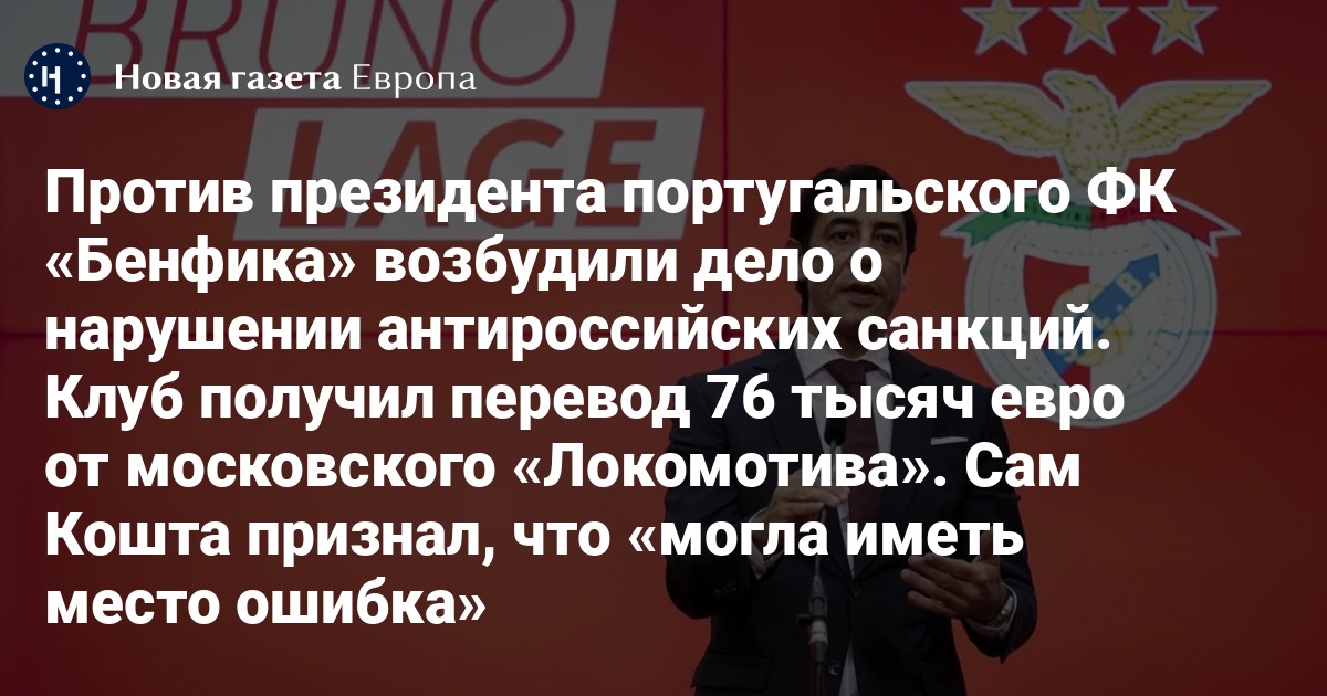Против президента португальского ФК «Бенфика» возбудили дело о нарушении антироссийских санкций. Клуб получил перевод 76 тысяч евро от московского «Локомотива»