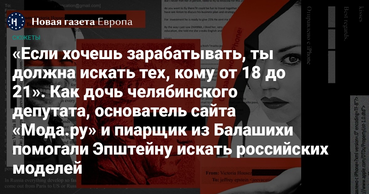 Скандальный финансист Джеффри Эпштейн постоянно искал новых девушек модельной внешности. Помогали ему в этом агенты со всего мира, в том числе и из России. Благодаря опубликованным Минюстом США документам, относящимся к делу Эпштейна, «Новая газета Европа» установила нескольких людей, которые за деньги помогали ему рекрутировать девушек из России. На момент контактов с российскими контрагентами Эпштейн уже отбыл наказание за организацию проституции, в том числе с участием несовершеннолетних.