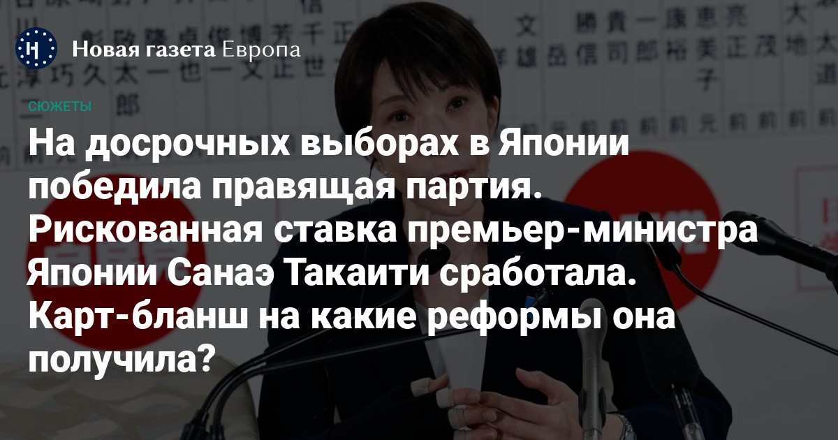 Маневр японского премьера Санаэ Такаити с назначением досрочных выборов в нижнюю палату парламента оказался полностью оправданным. Либерально-демократическая партия (ЛДП) существенно упрочила позиции, а ее лидер Такаити получила общественный мандат на реформы — в частности, агрессивное государственное стимулирование экономики и повышение расходов на оборону до 2%. Среди прочего, это может грозить новыми конфликтами в отношениях с Китаем, и без того далеко не безоблачных.